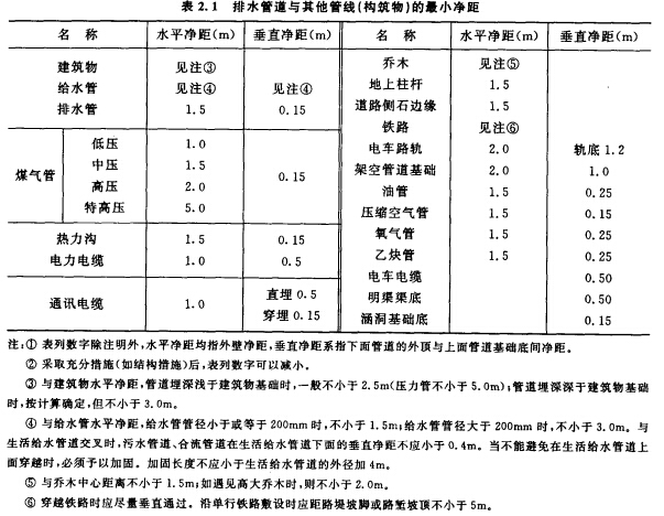 因此。污水管道與其他地下管線就設(shè)施的水平和垂直最小凈距應(yīng)按表2.1 [GSJ14-87(1997年版)]確定。