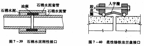 石棉水泥管的剛位接口用套環(huán)連接,套環(huán)由石棉水泥或鑄鐵材料制成,接口構(gòu)造如圖7-39所示。套環(huán)和管道的間隙約為12-15mm,套環(huán)中問填£泊麻,池麻兩側(cè)用石棉水泥填賽并打?qū)崱?BR>