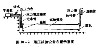 水泥管管道強(qiáng)度試驗(yàn)也稱落壓試驗(yàn),其試驗(yàn)設(shè)備布置如圖10-2所示。水泥管管道試驗(yàn)時(shí),可用試壓泵向管內(nèi)滾水分級(jí)升壓。每升壓一級(jí),都應(yīng)峻查后背、支墩、管身及接口的情況。如無(wú)異常時(shí),可繼續(xù)升壓,一直到壓力升高至試驗(yàn)壓力為止,保持恒壓10m1n,再檢查接口、管身,如無(wú)破損及漏水現(xiàn)象,則認(rèn)為水泥管管道強(qiáng)度試驗(yàn)合格。