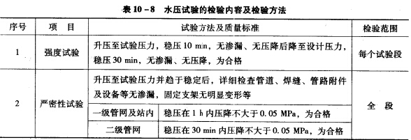 青島水泥管管道水壓試驗(yàn)的位驗(yàn)內(nèi)容及檢驗(yàn)方法應(yīng)符合表10-8的規(guī)定。試驗(yàn)合格后,應(yīng)按規(guī)定旗寫強(qiáng)度、嚴(yán)密性試驗(yàn)記錄。