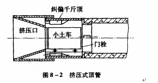 擠壓土層式頂管前端的工具管可分為錐形和管制形,僅適用于潮濕的教土、砂土、粉質(zhì)敷土,頂距較短的小口徑鋼管、鑄鐵管,且對地面變形要求不甚嚴(yán)格的地段。這種工具管安裝在被頂管道的前方,頂進(jìn)時,工具管借助千斤頂頂力為將管子直接擠人土層里,管子周圍的土層被擠密實,常引起地面較大的變形。其結(jié)構(gòu)形式如圖8-4所示。