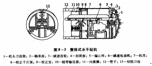 機(jī)械開挖式頂管通過裝在工具管前方的由電動機(jī)驅(qū)動的刀盤鉆進(jìn)挖土.被挖下來的土體由皮帶運(yùn)輸機(jī)運(yùn)出,從而代替了人工操作,一般適用于無地下水干擾、土質(zhì)穩(wěn)定的敷性土或砂性土層。其結(jié)構(gòu)形式如因8-3所示。